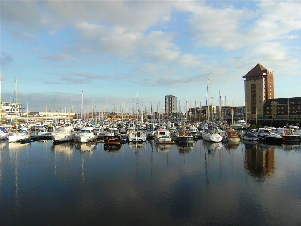 子午线码头塔(Meridian Quay)位于海滨,是威尔士最高的建筑,高107米(351 英尺),顶层(29层)设有餐厅。